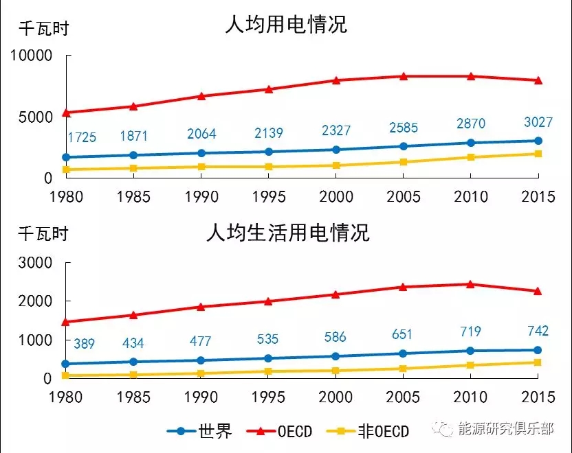 對比來看,經(jīng)濟合作與發(fā)展組織(OECD)國家人均用電顯現(xiàn)飽和態(tài)勢,近五年有所下降,而非OECD國家人均用電持續(xù)較快增長,顯示出經(jīng)濟社會發(fā)展對用電增長的有力拉動。1980~2015年,OECD國家人均用電年均增長1.1%,前三十年年均增長1.5%,后五年年均下降0.9%。非OECD國家人均用電年均增長3.1%,2015年的1989千瓦時僅為OECD國家(7945千瓦時)的25.0%。同期,OECD國家人均生活用電量年均增長1.2%,前三十年年均增長1.7%,后五年年均下降1.5%。非OECD國家人均生活用電量年均增長4.9%,2015年的420千瓦時僅為OECD國家(2267千瓦時)的18.5%。