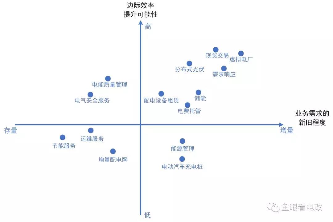 綜合能源服務(wù)有部分需求是傳統(tǒng)業(yè)務(wù)的需求,比如增量配電網(wǎng),實際上就是用電企業(yè)對供電服務(wù)的需求,這個需求和電改無關(guān),但是電改因為政策驅(qū)動,會使得一部分配電資產(chǎn)由非電網(wǎng)的社會資本進(jìn)行投資,從而在投資和運營效率上與電網(wǎng)企業(yè)的配電網(wǎng)形成競爭。所以從這個意義上說,增量配網(wǎng)的客戶需求不是新增的。