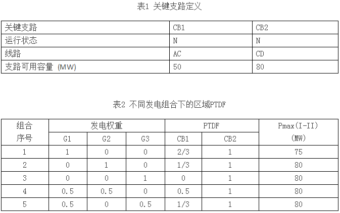 【算例分析】假設(shè)線路AB、BC、CA的阻抗均相同,區(qū)域1定義了兩條關(guān)鍵支路CB1和CB2,具體定義見表1。表2給出了四種不同的發(fā)電組合情況。比如,組合1下G1、G2、G3的發(fā)電權(quán)重為1、0、0,其含義為:區(qū)域I增加送出功率(向區(qū)域II送電)時,全部由G1提供;同樣,組合2的含義為區(qū)域I增加送出功率(向區(qū)域II送電)時,全部由G2提供;組合3的含義為區(qū)域I增加送出功率(向區(qū)域II送電)時,全部由G3提供。組合4稍微復(fù)雜一些, 當(dāng)區(qū)域I增加送出功率(向區(qū)域II送電)時,分別由G1和G2提供50%的出力。