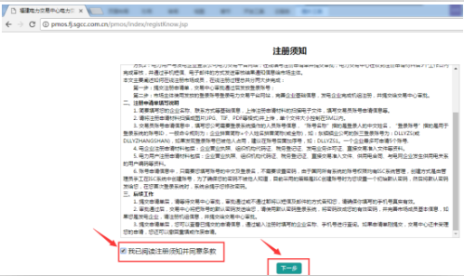 2.打開的注冊須知頁面,完整閱讀注冊須知后,勾選“我已閱讀注冊須知并同意條款”,并點(diǎn)擊下一步。如下圖所示: