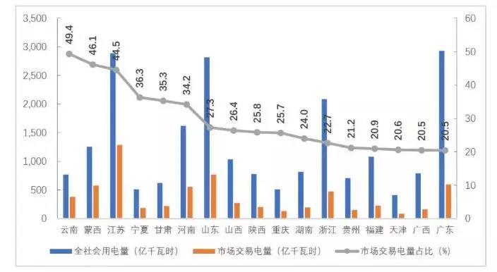 分省來看,市場(chǎng)交易電量占全社會(huì)用電量比重排序前三名的省份是云南、蒙西和江蘇,分別為49.4%、46.1%、44.5%;電力市場(chǎng)交易電量規(guī)模排序前三名的省份分別為江蘇1286億千瓦時(shí)、山東768億千瓦時(shí)、廣東599億千瓦時(shí);外受電市場(chǎng)交易電量排序前三名的省份分別是江蘇286億千瓦時(shí)、山東242億千瓦時(shí)和浙江160億千瓦時(shí)。