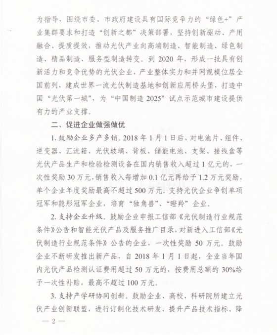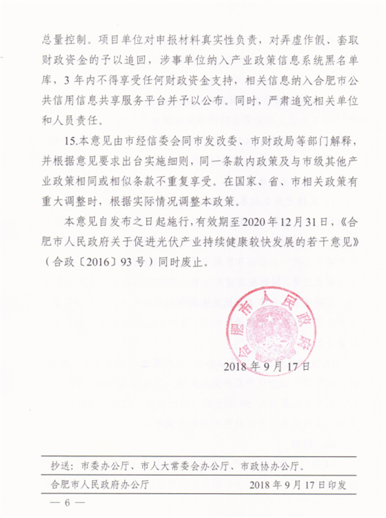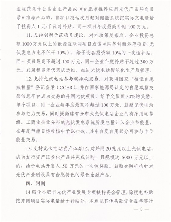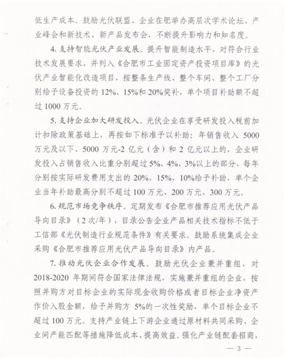 近日,安徽合肥市人民政府發(fā)布《關(guān)于進(jìn)一步促進(jìn)光伏產(chǎn)業(yè)持續(xù)健康發(fā)展的意見》。意見中稱,支持創(chuàng)新示范項(xiàng)目建設(shè),企業(yè)投資總額1000萬元以上的能源互聯(lián)網(wǎng)項(xiàng)目或微電網(wǎng)等創(chuàng)新示范項(xiàng)目(光伏電站占比不低于10%),給予設(shè)備投資額10%的一次性補(bǔ)貼,同一項(xiàng)目最高不超過150萬元,同一企業(yè)年度補(bǔ)貼不超過300萬。