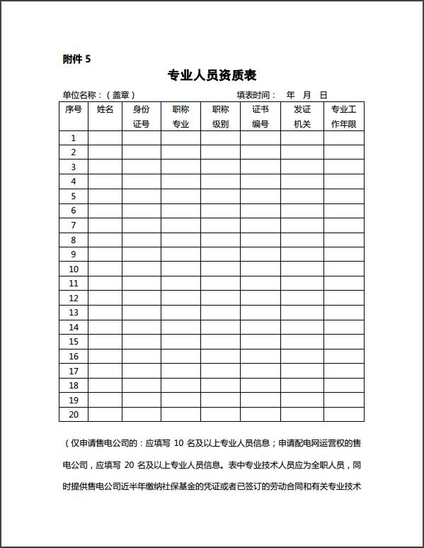 (七)專業(yè)人員資質(zhì)表(詳見附件5)、專業(yè)人員身份證復(fù)印件及學(xué)歷證書、職稱證書復(fù)印件。所列專業(yè)技術(shù)人員必須為該售電公司全職人員,從業(yè)人員資質(zhì)證明不得重復(fù)使用。
