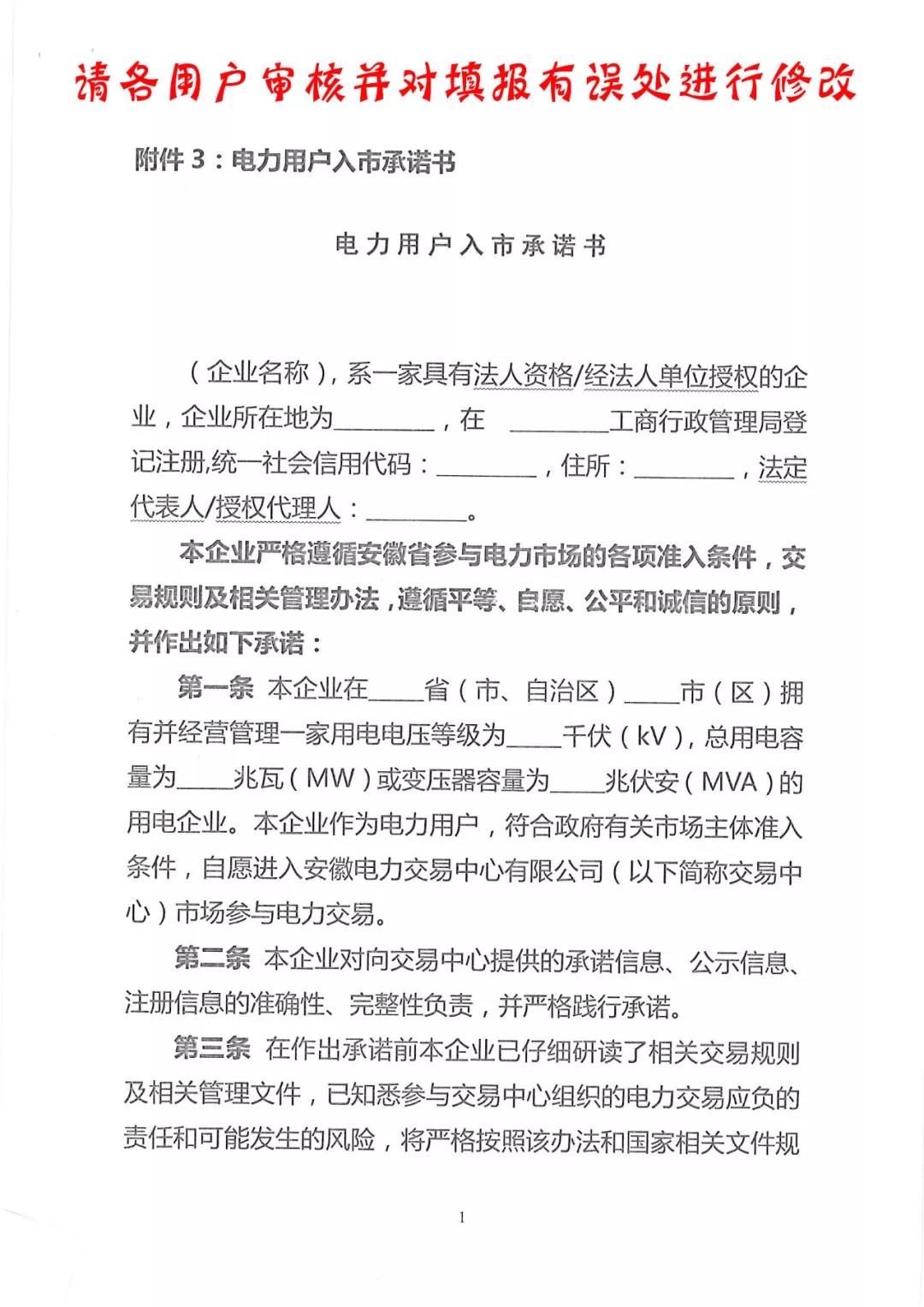 為減輕企業(yè)申報負擔,現(xiàn)本公司對電力用戶《附件2:申請書、附件3:電力用戶入市承諾書、附件4:交易平臺使用協(xié)議》信息進行初步填寫工作。并將已填寫附件發(fā)至各電力用戶,請各用戶審核,并對填報有誤處進行修改。