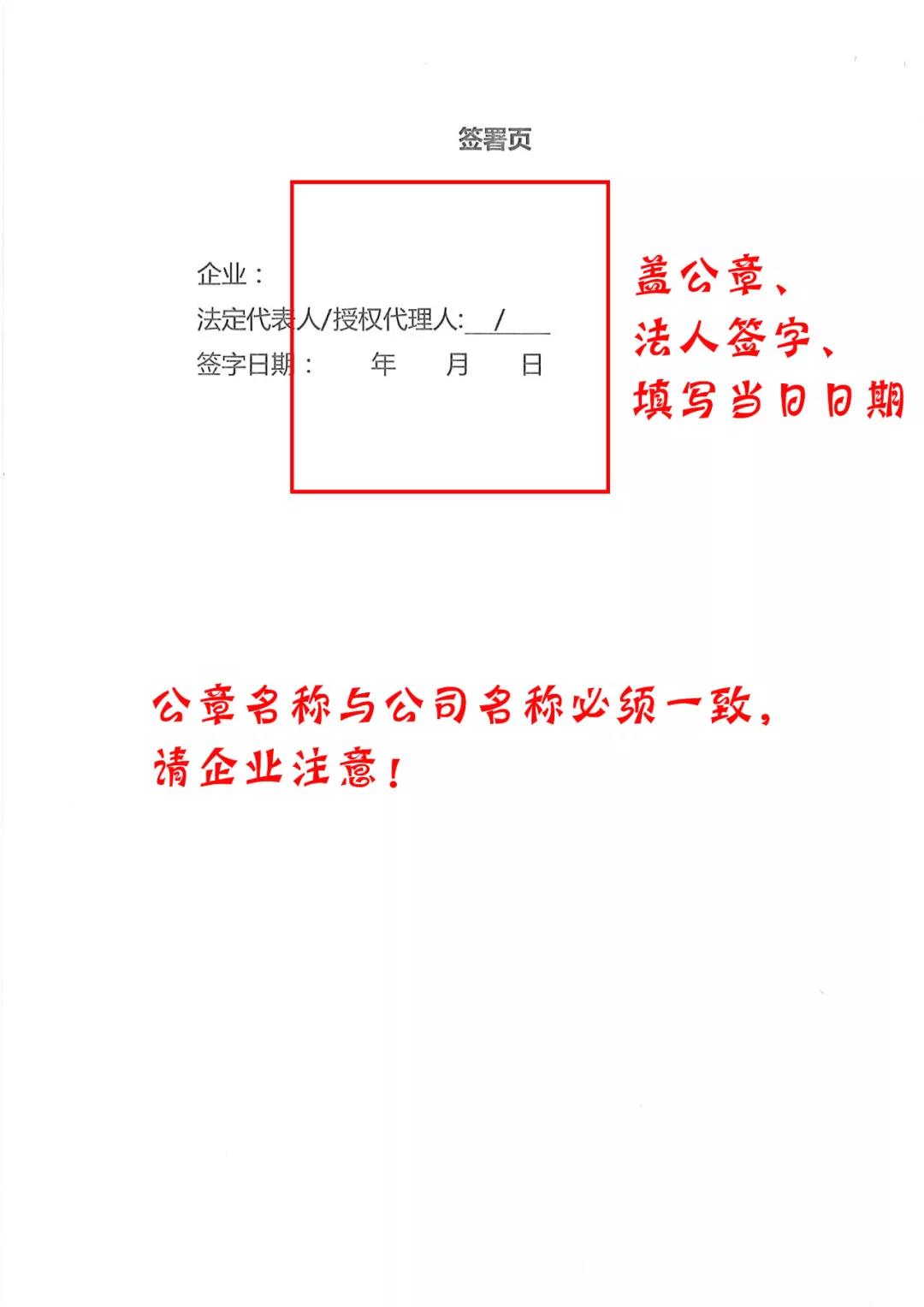 3.蓋章區(qū)域詳見下方蓋章說明操作流程:附件2(申請書):右下角公司名稱蓋章。附件3(承諾書):承諾單位處蓋章、法定代表人簽名或加蓋法人簽章,承諾時間請?zhí)顚懮w章當日時間。附件4(交易平臺使用協(xié)議):封面企業(yè)名稱處蓋章、簽署頁蓋章、法人簽字或加蓋法人章并填寫日期。