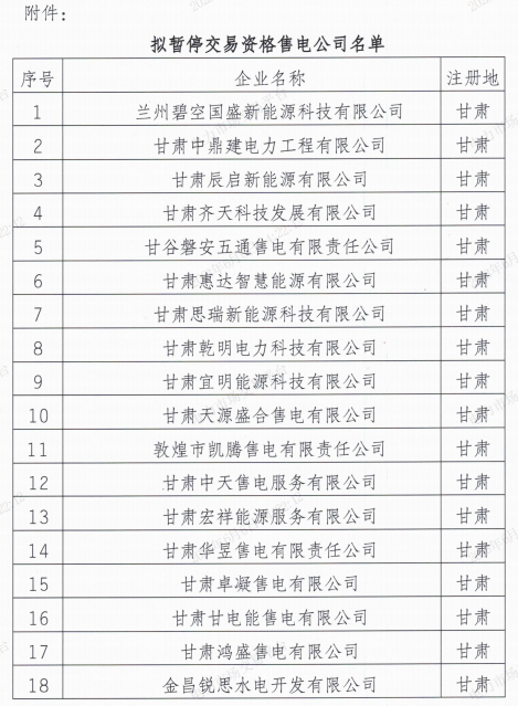 根據(jù)國家發(fā)展改革委、國家能源局《售電公司管理辦法》(發(fā)改體改規(guī)﹝2021﹞1595號(hào))第二十七條“連續(xù)12個(gè)月未進(jìn)行實(shí)際交易的售電公司,電力交易機(jī)構(gòu)征得地方主管部門同意后暫停其交易資格,重新參與交易前須再次進(jìn)行公示”之規(guī)定,甘肅電力交易中心有限公司對在甘肅電力交易平臺(tái)注冊的售電公司(含外省推送甘肅)實(shí)際參與甘肅電力市場交易情況進(jìn)行梳理,核實(shí)蘭州碧空國盛新能源科技有限公司等266家售電公司已連續(xù)12個(gè)月未進(jìn)行實(shí)際交易。經(jīng)國家能源局甘肅監(jiān)管辦公室同意,對上述266家售電公司參與甘肅電力市場交易資格啟動(dòng)暫停程序,現(xiàn)予以公示。具體售電公司名單詳見附件。