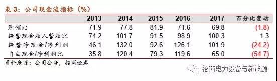 1.經(jīng)營(yíng)穩(wěn)健,效率提升,盈利及現(xiàn)金流表現(xiàn)良好:2017年公司收入242億,同比下降14%,主要系電網(wǎng)自動(dòng)化中設(shè)備租賃項(xiàng)目全年業(yè)主未回購,收入無法確認(rèn)所致。公司毛利率及凈利率分別提升5個(gè)點(diǎn)及3個(gè)點(diǎn),至30%、15%,ROE超16%,盡管匯兌損益導(dǎo)致了財(cái)務(wù)費(fèi)用的增加,但費(fèi)用率水平較低,賒銷比進(jìn)一步下降,報(bào)表更加扎實(shí)。
