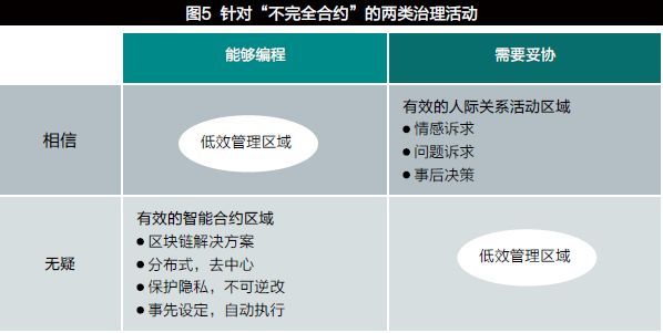 如圖5所示,在處理不完全合約時,對于可以編程的活動和任務,消除不信任(無疑)的區(qū)塊鏈有應用效果。對于不可編程,需要事先、事中、事后談判妥協(xié)的活動和任務,圍繞情感和情緒管理的“相信”更加有效。