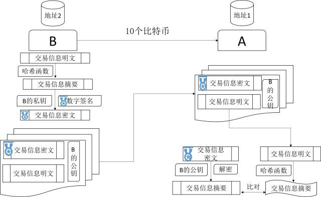 上述過程中,A和B都是匿名的,相互不知道對方的信用情況,但系統(tǒng)利用非對稱加密技術,通過對交易信息和地址的驗證保障了信息的真實性。