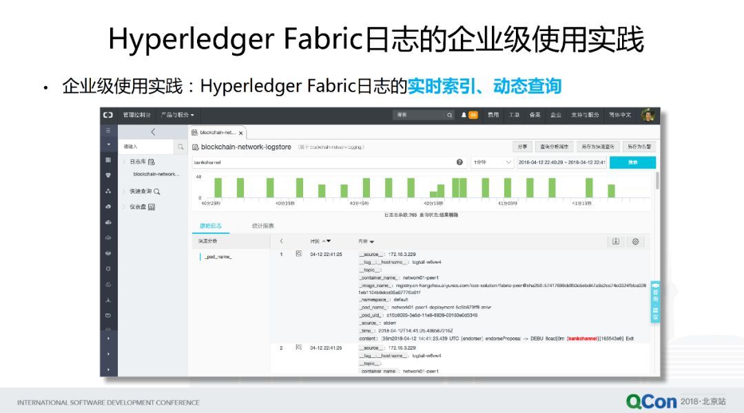 那么到底企業(yè)級(jí)的運(yùn)維與業(yè)務(wù)分析需要怎樣的 Fabric 日志的工具或者能力呢?其實(shí)這種區(qū)塊鏈的業(yè)務(wù)系統(tǒng)可以結(jié)合,比如說(shuō)云平臺(tái)的日志服務(wù),或者像開(kāi)源的 ELK 方案去搭建出日志分析系統(tǒng),去跟區(qū)塊鏈整合起來(lái)。下面舉幾個(gè)例子說(shuō)明我們需要哪些能力。第一個(gè)就是我們希望對(duì)區(qū)塊鏈業(yè)務(wù)系統(tǒng)的日志實(shí)現(xiàn)實(shí)時(shí)索引以及動(dòng)態(tài)查詢的能力。比如說(shuō)這個(gè)例子里面,我們是用阿里云的區(qū)塊鏈解決方案整合了阿里云日志服務(wù)來(lái)進(jìn)行示例,這里我們需要對(duì)某一個(gè)業(yè)務(wù) Channel 來(lái)進(jìn)行實(shí)時(shí)的索引查詢,來(lái)看這個(gè)日志的一些分布,以及跟這個(gè)業(yè)務(wù) Channel 相關(guān)的日志信息,可以通過(guò)關(guān)鍵字,以及像一些類 SQL 的查詢語(yǔ)句來(lái)快速實(shí)現(xiàn)查詢。