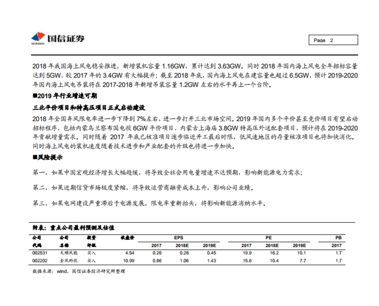 2018年全國(guó)棄風(fēng)限電率進(jìn)一步下降到7%左右,進(jìn)一步打開三北市場(chǎng)空間。2019年國(guó)內(nèi)多個(gè)平價(jià)甚至競(jìng)價(jià)項(xiàng)目有望啟動(dòng)招標(biāo)程序,包括內(nèi)蒙烏蘭察布國(guó)電投6GW平價(jià)項(xiàng)目、內(nèi)蒙古上海廟3.8GW特高壓外送配套項(xiàng)目,預(yù)計(jì)將在2019-2020年貢獻(xiàn)增量需求。同時(shí)隨著2017年底已核準(zhǔn)項(xiàng)目逐步臨近開工最后時(shí)限,低風(fēng)速地區(qū)的存量核準(zhǔn)項(xiàng)目也將加快消化。同時(shí)海上風(fēng)電的裝機(jī)速度隨著技術(shù)進(jìn)步和產(chǎn)業(yè)配套的升級(jí)也將進(jìn)一步加快。