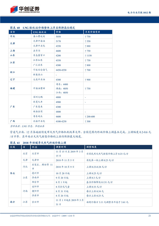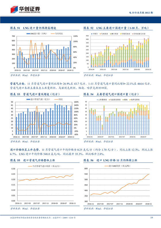 1-11月天然氣累計產(chǎn)量1438億方,同比+6.6%;10月單月產(chǎn)量143億方,同比+10.1%。1-11月天然氣累計進口量8182萬噸,同比+34.5%;11月單月進口量915萬噸,同比+39.8%。進入供暖季后全國LNG均價受大幅降溫影響12月上旬價格拉升至5000元/噸以上,但由于供需矛盾的緩解,氣價12月中下旬回調(diào)至相對穩(wěn)定位置,但同比去年同期大幅下跌。而管道氣方面全國范圍內(nèi)終端價格持續(xù)推進旺季價格調(diào)整,漲幅為0.2-0.6元/方。我們認為終端順價的推進和現(xiàn)貨LNG補充需求的下降以及LNG價格的同比下降都有望緩解城燃公司的成本壓力。