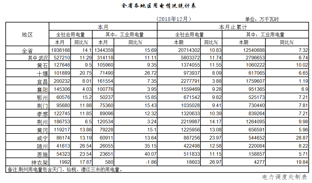 (六)全省各地區(qū)用電普遍增長,武漢市領(lǐng)頭羊地位作用發(fā)揮較好。2018年全省14個用電統(tǒng)計地區(qū)全社會用電普遍增長,其中武漢、荊州、黃石等9個地區(qū)全社會用電增幅超過兩位數(shù)。各地區(qū)工業(yè)用電同樣全部不同程度增長,其中黃石、咸寧和神農(nóng)架林區(qū)3個地區(qū)增幅在兩位數(shù)以上。省會城市武漢全年全社會用電量580.34億千瓦時,超過全省用電總量的四分之一,增長11.74%,超過全省平均水平0.91個百分點,充分發(fā)揮了其領(lǐng)頭羊的地位作用。“兩副”城市宜昌、襄陽全社會用電量分別為227.78億千瓦時和155.95億千瓦時,分別增長3.88%和9.28%,保持了較為穩(wěn)健的增長。