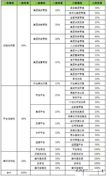 集團(tuán)管理軟件產(chǎn)品選型指標(biāo)整體框架及權(quán)重分配