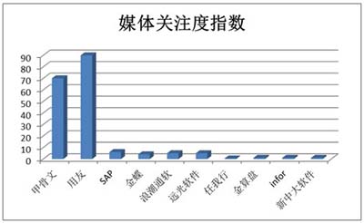 媒體關(guān)注度方面:9月份,“用友用戶大會”和“甲骨文全球大會”相繼召開,用友軟件與甲骨文均獲得超高媒體關(guān)注度,關(guān)注度指數(shù)分別達到90與70,遠高于其它ERP品牌;SAP排名第三,關(guān)注度為6。(如下圖所示)。