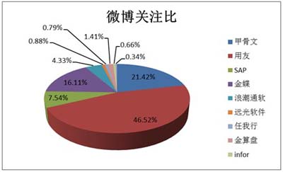 通過對新浪微博認證用戶傳播統(tǒng)計,9月份,最愛微博用戶關(guān)注的品牌是用友,在所有對ERP的關(guān)注中,用戶獲得46.52%的關(guān)注,居首位;SAP第二,獲得21.42%的關(guān)注;甲骨文第三,獲得16.11%的微博用戶關(guān)注。(如下圖所示)。