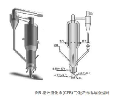 循環(huán)流化床(CFB)氣化爐由下部、上部及尾部三個(gè)部分組成,內(nèi)部設(shè)有耐熱防磨內(nèi)襯。氣化爐結(jié)構(gòu)與原理見圖5。