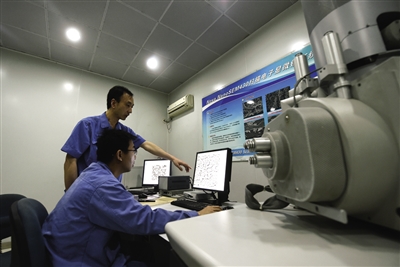 在山西太鋼集團(tuán)技術(shù)中心基礎(chǔ)與應(yīng)用研究室,工程師正在通過掃描電子顯微鏡查看新產(chǎn)品的內(nèi)部結(jié)構(gòu)。記者 燕雁 攝
