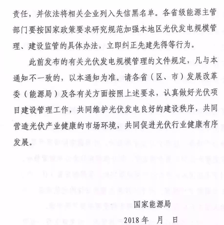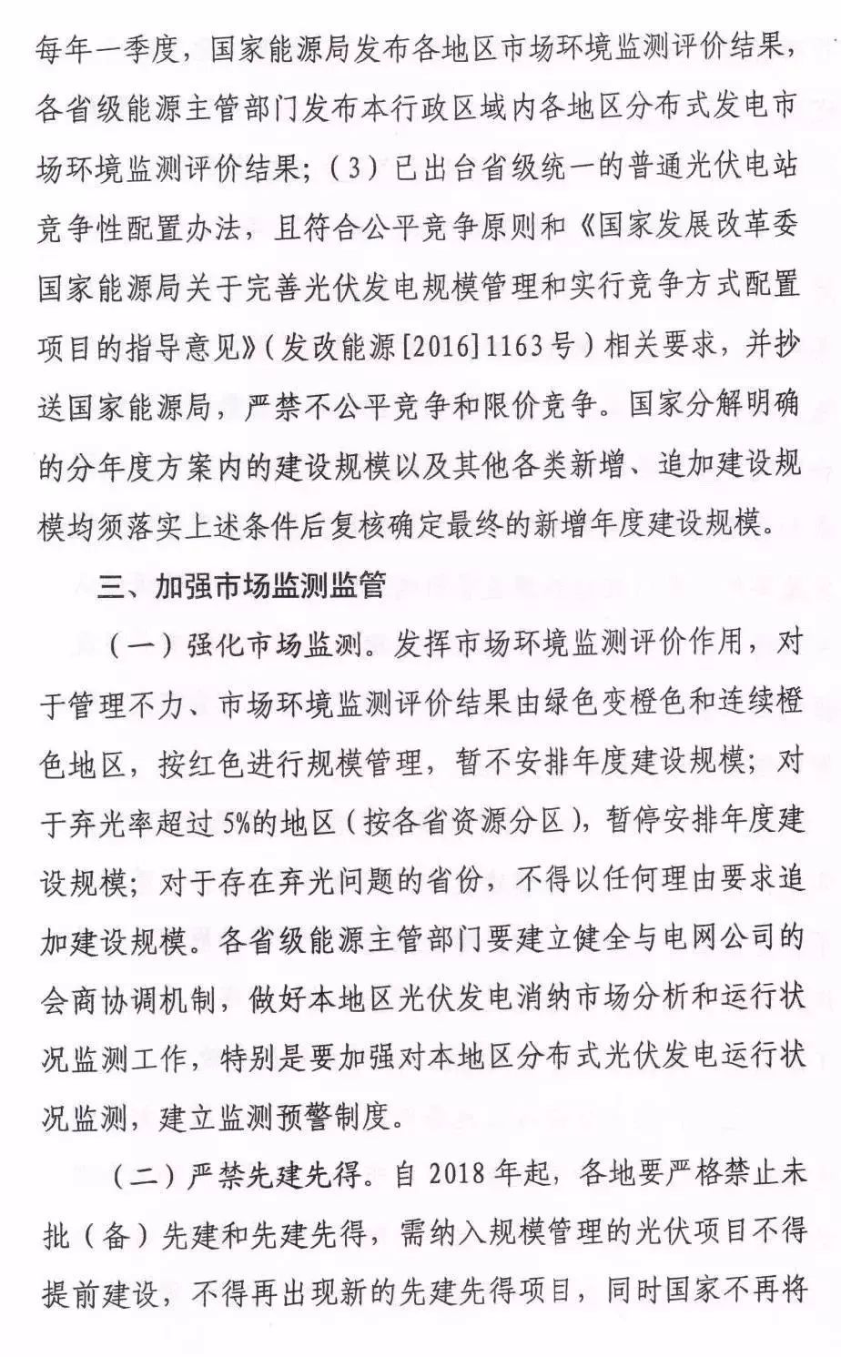 自2018年起,各地要嚴(yán)格禁止未批(備)先建和先建先得,需納入規(guī)模管理的光伏項(xiàng)目不得提前建設(shè),不得再出現(xiàn)新的先建先得項(xiàng)目,同時(shí)國(guó)家不再將其納入可再生能源基金補(bǔ)貼范圍。