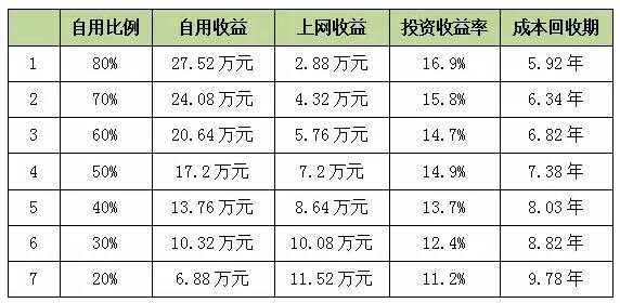 最后比較一下自用電各比例的投資收益率和成本回收期。