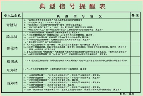 2.2 典型信號(hào)提醒表:此類信號(hào)并不是設(shè)備異常信息,但在工作中會(huì)時(shí)不時(shí)的發(fā)出,在判斷上容易產(chǎn)生誤導(dǎo),為了避免不必要的精力支出,我們將這類信號(hào)匯總提醒值班員。例如:220KV開關(guān)收發(fā)信機(jī)動(dòng)作信號(hào)、備用開關(guān)的異常信號(hào)等都可以通過此表來排除,加強(qiáng)設(shè)備巡視與監(jiān)控質(zhì)量。