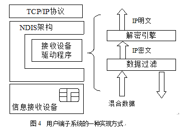 解密引擎利用智能IC卡提供的解密密鑰,對(duì)IP密文進(jìn)行解密運(yùn)算,并輸出IP明文到對(duì)應(yīng)的上層數(shù)據(jù)接收/解釋程序。