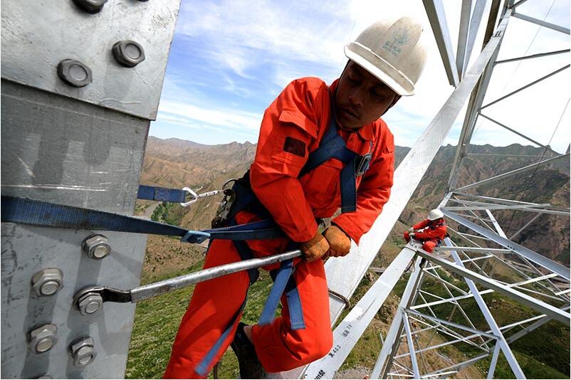 在山西繁峙縣境內(nèi)的高山大嶺間,湖北省送變電工程公司施工人員對(duì)蒙西~天津南1000千伏特高壓交流輸變電工程線路工程8標(biāo)段組立3L463號(hào)百米高塔。當(dāng)日,經(jīng)過一年施工,該標(biāo)段鐵塔組立即將完成,全線進(jìn)入最后的架線施工階段。