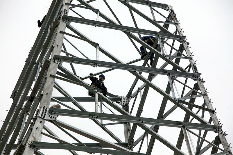 施工人員在內(nèi)蒙古錫盟-江蘇泰州±800千伏特高壓直流輸電線路工程連云港市贛榆段沙河鎮(zhèn)施工現(xiàn)場(chǎng)進(jìn)行直流輸電線路工程鐵塔組建作業(yè)。
