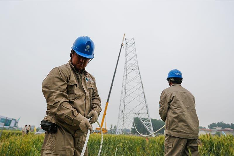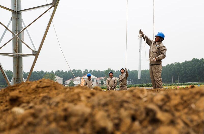 【背景】 施工人員在內(nèi)蒙古錫盟-江蘇泰州±800千伏特高壓直流輸電線路工程連云港市贛榆段沙河鎮(zhèn)施工現(xiàn)場(chǎng)進(jìn)行直流輸電線路工程鐵