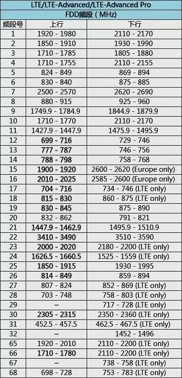 我們再比較一下LTE的頻段分配: