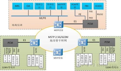 傳統(tǒng)的電力通信網(wǎng)采用MSTP/SDH設備+PCM設備組網(wǎng)如圖 1所示: