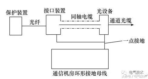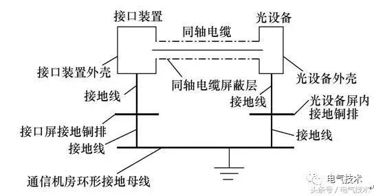 接口裝置到光設(shè)備之間同軸電纜屏蔽層的接地方式如圖2所示。從圖中可以看出,同軸電纜的屏蔽層分別接在接口裝置和光設(shè)備的外殼,然后通過接地線接到屏內(nèi)的接地銅排,再經(jīng)接地銅排接到機(jī)房內(nèi)的環(huán)形接地母線上接地。