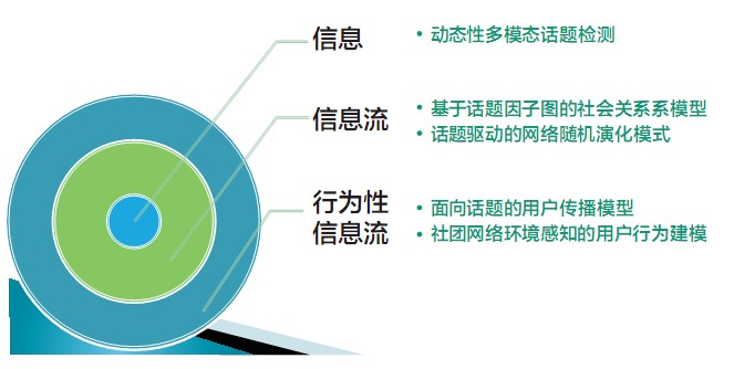 楊士強教授給出了信息→信息流→行為性信息流的新挖掘思路。在信息層面, 通過內(nèi)容理解, 進行信息內(nèi)容的語義挖掘; 在信息流層面, 進行結(jié)構(gòu)分析, 進行信息傳播的結(jié)構(gòu)挖掘及演化規(guī)律挖掘; 在行為性信息流層面,通過行為建模, 進行用戶偏好挖掘 (如圖) 。