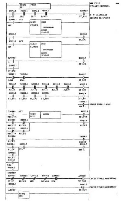按照前面的設(shè)計思路,在數(shù)控機床PMC程序中增加P110子程序,生成R2.7(STS.A);其中循環(huán)啟動準備好指示燈信號輸出點為y15.1,返修鍵信號輸入點為X4.6,返修指示燈信號輸出點為Y4.6。相應(yīng)的梯形圖如圖1示。