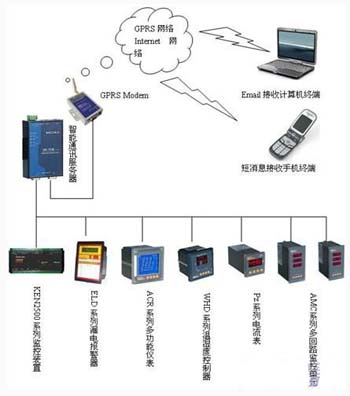 基于GPRS箱變遠(yuǎn)程監(jiān)控系統(tǒng)采用三層網(wǎng)絡(luò)結(jié)構(gòu),如圖2所示,即現(xiàn)場層、通訊層、管理層。現(xiàn)場層主要由智能儀表組成主要完成箱變內(nèi)部電量與非電量的數(shù)據(jù)采集;通訊層主要由智能通訊服務(wù)器、GPRS MODEM組成,主要實(shí)現(xiàn)現(xiàn)場數(shù)據(jù)的集中采集和通訊管理;管理層不設(shè)監(jiān)控中心,主要由移動數(shù)據(jù)終端(用戶手機(jī)、email郵箱等)組成,主要用于接收箱變內(nèi)部運(yùn)行數(shù)據(jù);系統(tǒng)借助于移動的GPRS網(wǎng)絡(luò)實(shí)現(xiàn)數(shù)據(jù)的遠(yuǎn)程采集和管理。