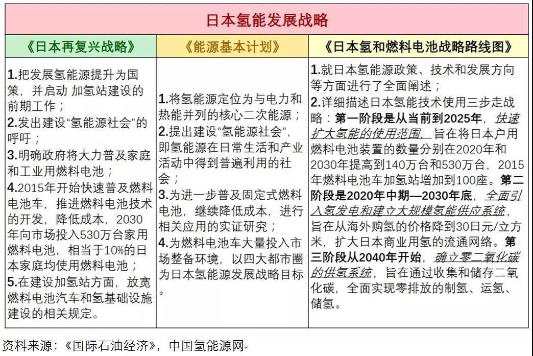 日本主要的國(guó)家戰(zhàn)略有《日本再?gòu)?fù)興戰(zhàn)略》、《能源基本計(jì)劃》和《氫能/燃料電池戰(zhàn)略發(fā)展路線圖》。