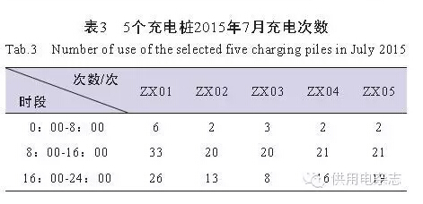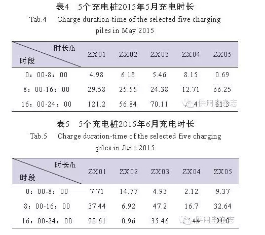 表4~表6統(tǒng)計(jì)的為5個(gè)充電樁2015年5月、6月和7月的充電時(shí)長(zhǎng),可以看出,電動(dòng)小汽車在辦公區(qū)的公用充電樁上在8:00-16:00和16:00-24:00時(shí)段的充電時(shí)間要比0:00-8:00時(shí)段充電時(shí)間長(zhǎng)。結(jié)合表1至表3的數(shù)據(jù)計(jì)算得出5個(gè)充電樁2015年5月至7月每次充電的平均時(shí)長(zhǎng),見表7。從表7可以看出,2015年5月至7月每個(gè)月每個(gè)充電樁每次平均充電使用時(shí)長(zhǎng)在0.9h至3.27h之間,3個(gè)月每個(gè)充電樁每次平均充電使用時(shí)長(zhǎng)約2h。與電動(dòng)汽車充滿電需要5~6h相比,表明電動(dòng)汽車在公共收費(fèi)充電樁上充電以補(bǔ)充電量為主,而主要充電時(shí)間在家或者充電站。
