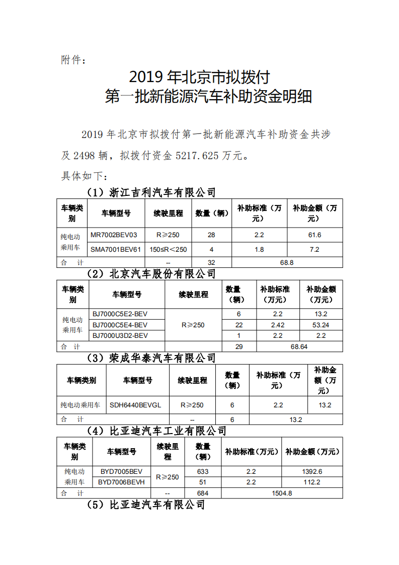 附件:2019年北京市擬撥付第一批新能源汽車補助資金明細