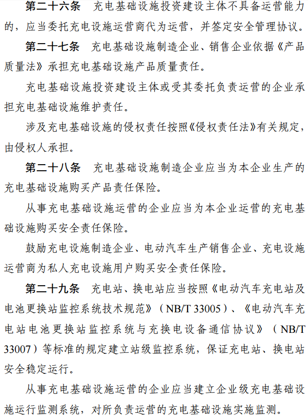 電動汽車生產(chǎn)銷售企業(yè)應(yīng)當(dāng)將充電設(shè)施建設(shè)維護(hù)納入其銷售服務(wù)體系,委托充電設(shè)施施工企業(yè)提供施工服務(wù)或委托充電設(shè)施運營商提供綜合性服務(wù)。與私人用戶簽訂銷售車輛合同之前,應(yīng)當(dāng)告知用戶提供的充電樁產(chǎn)品參數(shù)、價格、產(chǎn)品責(zé)任保險、建設(shè)維護(hù)服務(wù)內(nèi)容、服務(wù)收費標(biāo)準(zhǔn)等基本信息。用戶可選擇接受電動汽車生產(chǎn)銷售企業(yè)提供的產(chǎn)品和服務(wù),也可另行委托充電設(shè)施運營商提供綜合性服務(wù)。