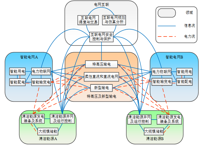 智能電網(wǎng)是GEI的重要支撐,是清潔能源利用和消納的主體,直接保障區(qū)域電網(wǎng)的互聯(lián)互通、安全穩(wěn)定、綠色高效運(yùn)行。主要包括智能輸變電、智能配電域、智能用電、電力物聯(lián)網(wǎng)4個子域。前3個子域之間建立電氣與通信連接,電力物聯(lián)網(wǎng)通過信息流將3個子域關(guān)聯(lián)起來,通過多領(lǐng)域協(xié)作實(shí)現(xiàn)智能輸變電與其他國家智能電網(wǎng)和清潔能源基地互聯(lián)的目標(biāo)。