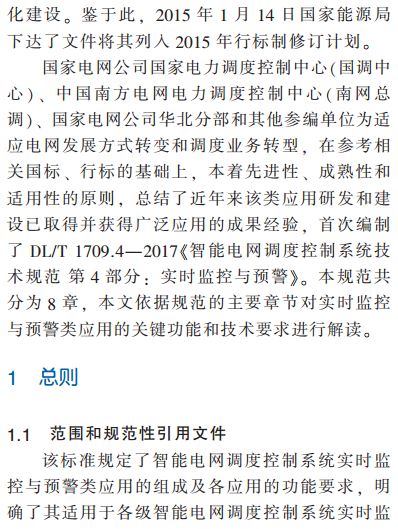 本文在對(duì)中國(guó)智能電網(wǎng)調(diào)度控制系統(tǒng)實(shí)時(shí)監(jiān)控與預(yù)警類應(yīng)用功能研究的基礎(chǔ)上,對(duì)今年來(lái)相關(guān)應(yīng)用建設(shè)和實(shí)用化成果進(jìn)行提煉總結(jié),形成電力行業(yè)標(biāo)準(zhǔn)DL/T 1709.4-2017《智能電網(wǎng)調(diào)度控制系統(tǒng)技術(shù)規(guī)范第4部分:實(shí)時(shí)監(jiān)控與預(yù)警》。分別從總體原則和接口要求、電網(wǎng)實(shí)時(shí)監(jiān)控與智能告警、電網(wǎng)自動(dòng)控制、電網(wǎng)運(yùn)行分析與決策、輔助監(jiān)測(cè)等方面對(duì)該規(guī)范進(jìn)行解讀,重點(diǎn)對(duì)每個(gè)應(yīng)用的功能要求和核心要點(diǎn)進(jìn)行解釋說(shuō)明,可進(jìn)一步提高調(diào)度自動(dòng)化人員對(duì)該類功能的正確使用,便于相關(guān)研究、設(shè)計(jì)、開發(fā)、建設(shè)和運(yùn)行維護(hù)人員對(duì)該標(biāo)準(zhǔn)的理解。