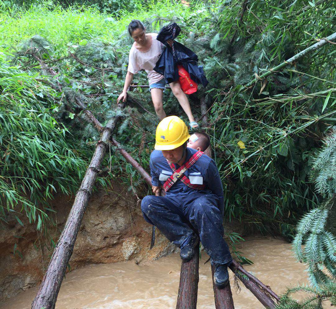 山洪沖毀了路面,他攀扶著一棵倒下的杉樹,小心翼翼地行走通過兩根倒塌的杉木為他們架設(shè)的“橋梁”,帶母子成功“渡河”。最終,陳麗強(qiáng)他們帶著母子倆來到了安全道路,才告別母子倆??粗缸觽z往醫(yī)院方向趕去,陳麗強(qiáng)他們又繼續(xù)趕赴故障巡視排查了。